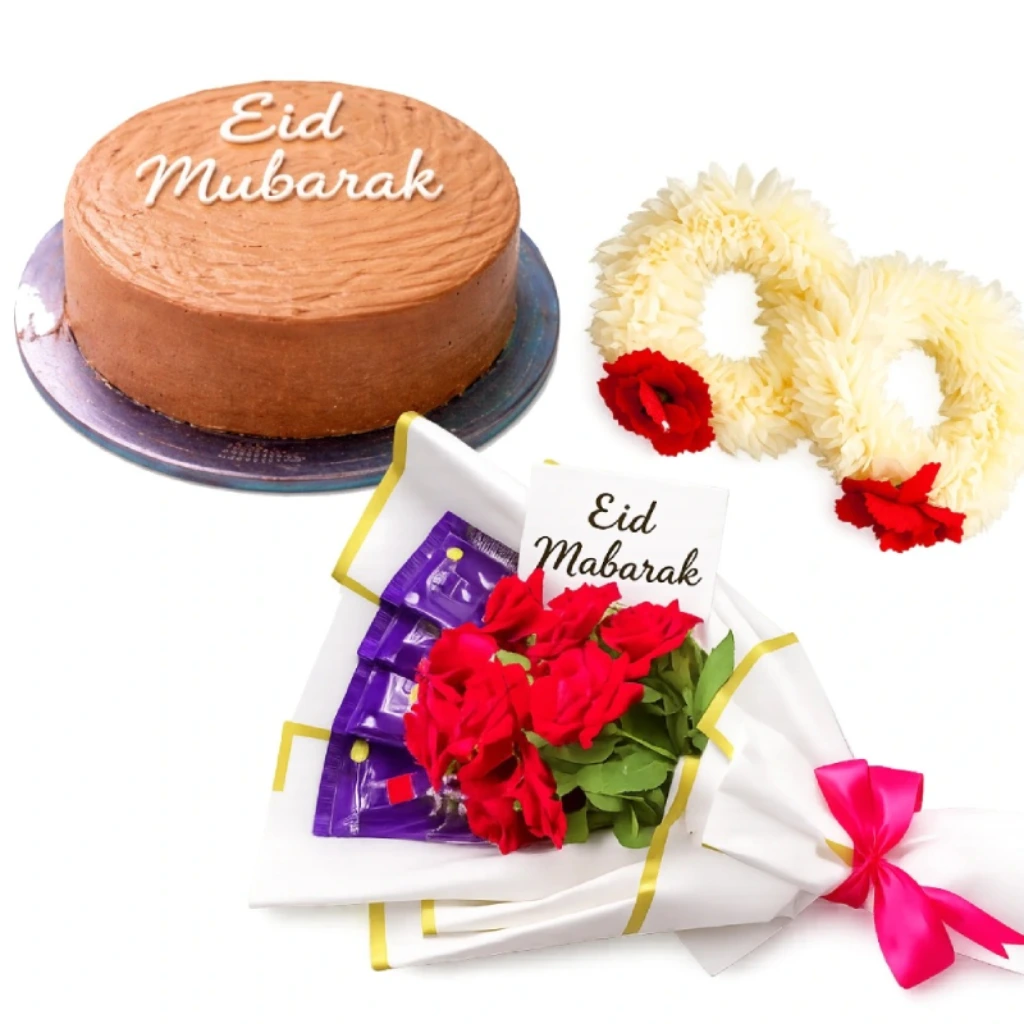 Celebrate Eid with the Eid Celebration Treat, featuring a beautiful chocolate flower bouquet, 1 pair of gajra, and 2 pounds of delicious cake. This thoughtful gift combines sweet treats and traditional elegance, perfect for sharing joy with loved ones during the festive season.