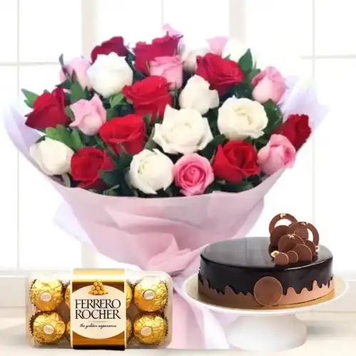 Bouquet of 20 Red , Pink, and White roses in a paper packing, 1/2kg Chocolate Cake and 16 pcs Ferrero Rocher Chocolate Box